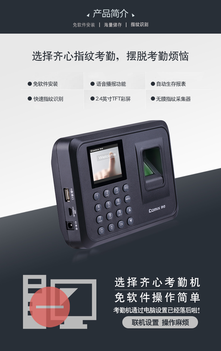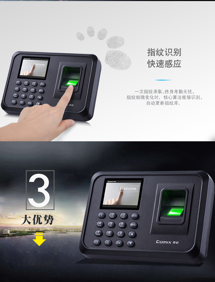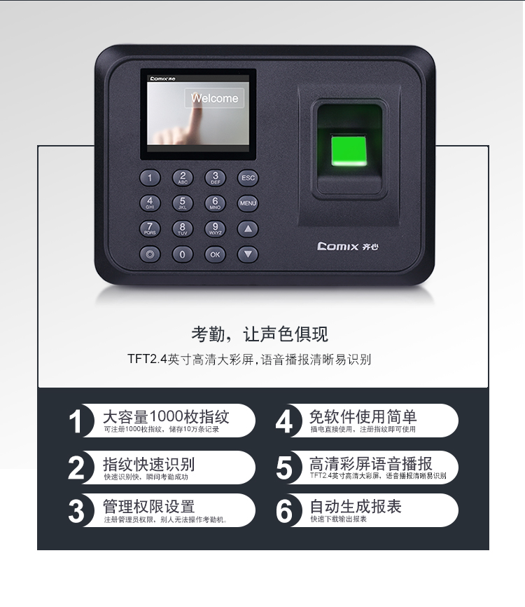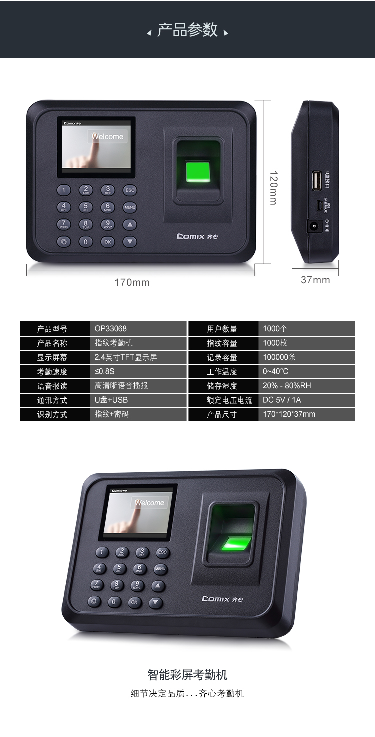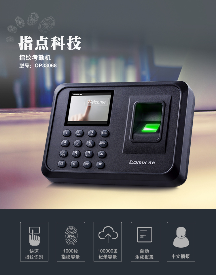 齐心(Comix)指纹打卡机 考勤机OP33068智能彩屏大容量储存快速考勤打卡机自动生成报表免软件安装