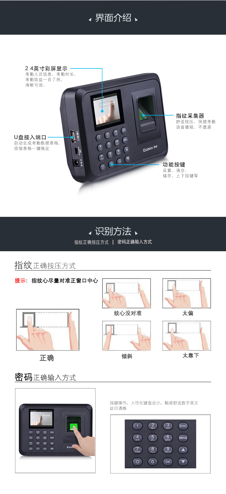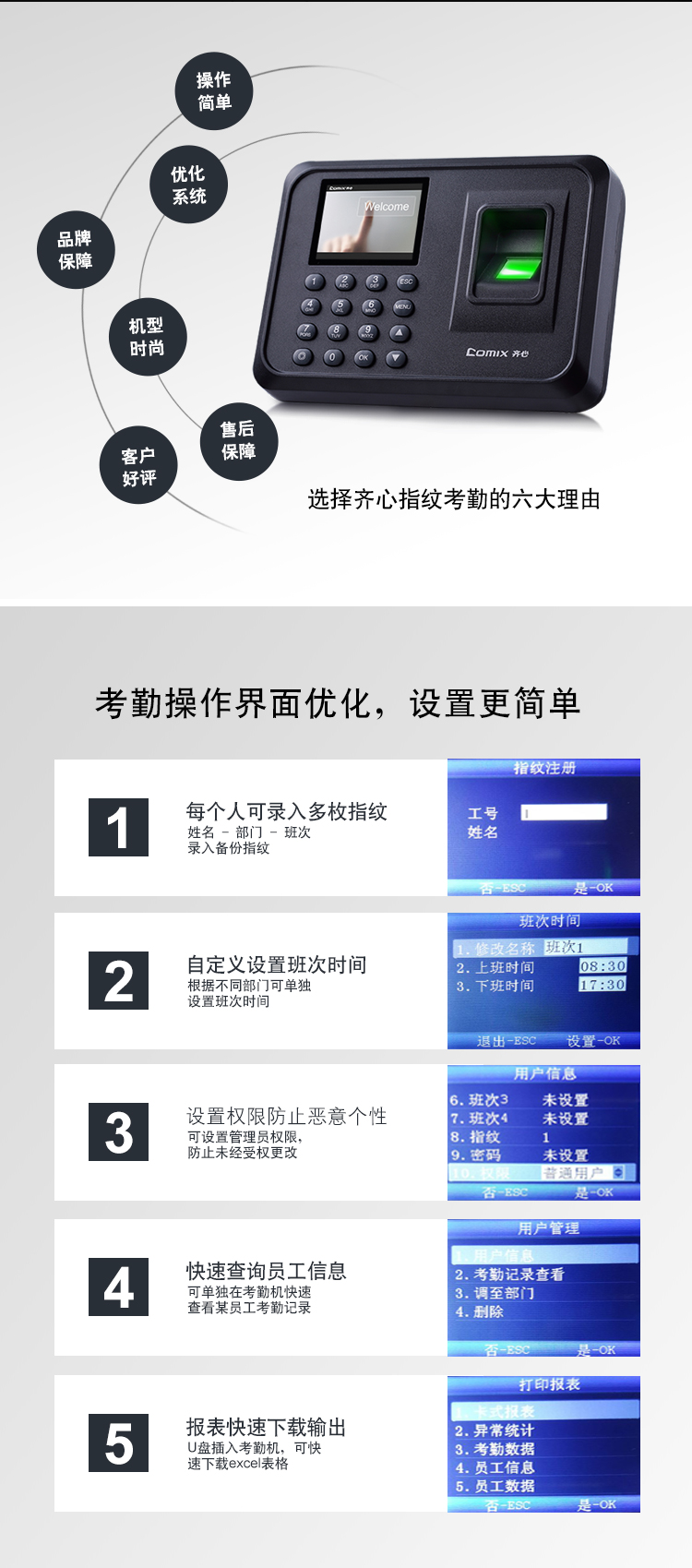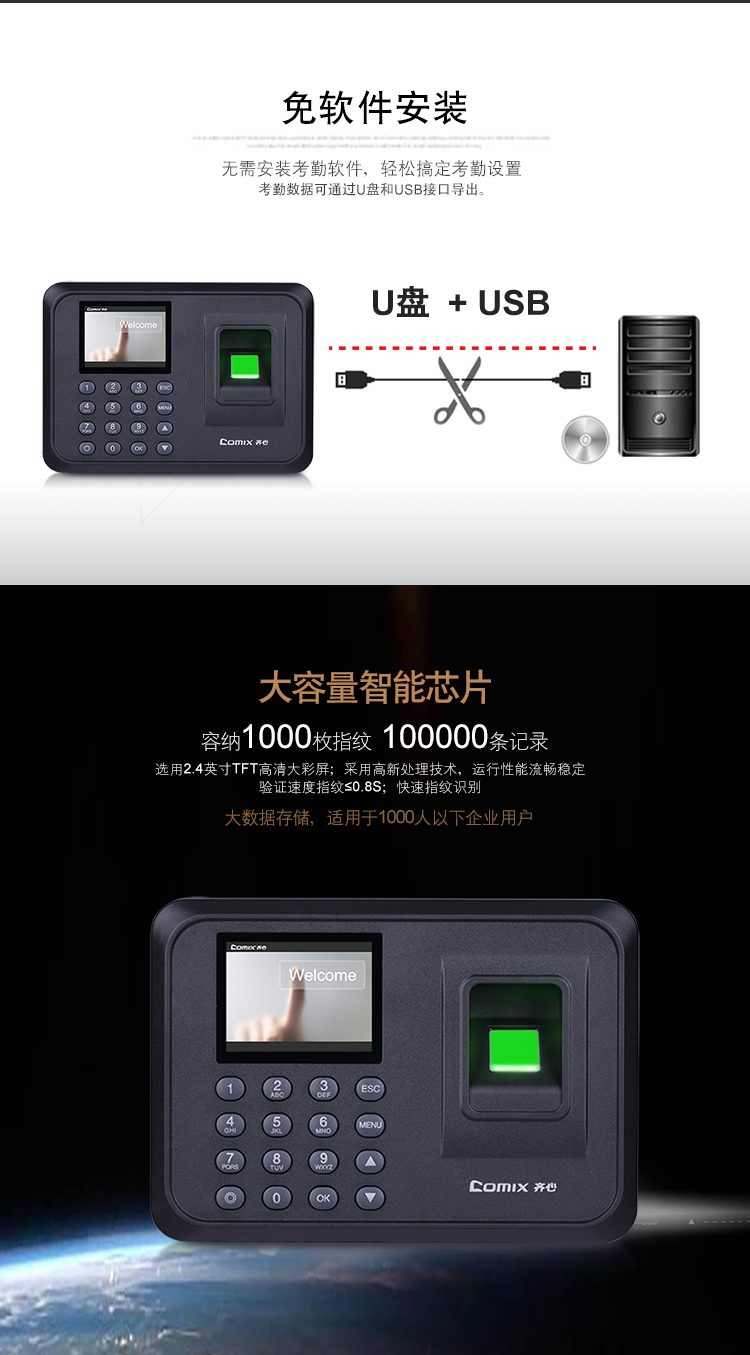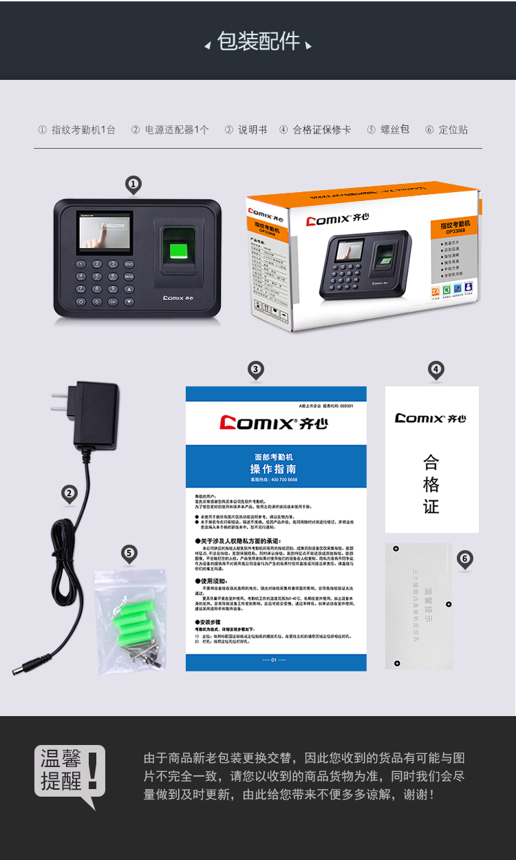 齐心(Comix)指纹打卡机 考勤机OP33068智能彩屏大容量储存快速考勤打卡机自动生成报表免软件安装