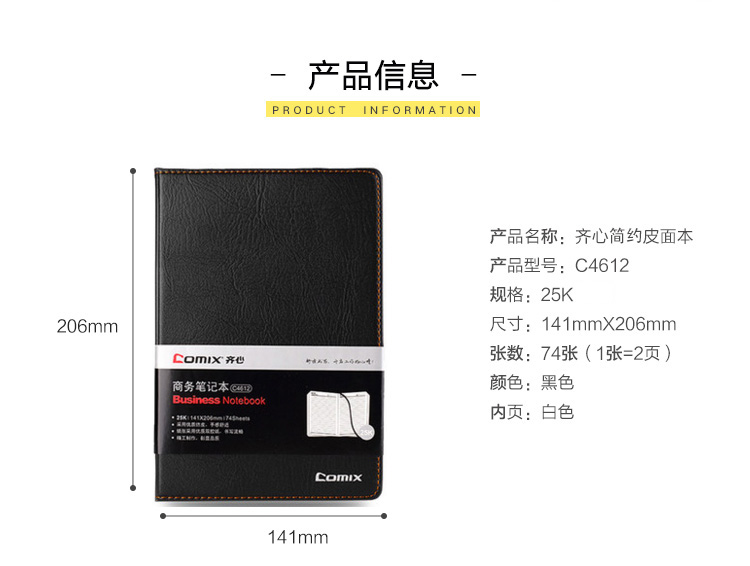 齐心C4612商务办公会议简约皮面本记事本笔记本黑色本子办公用品 25K黑 74张 C4612
