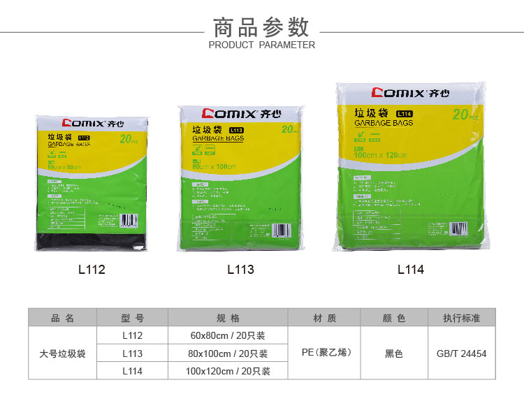 齐心 Comix 20个装 大号垃圾袋100*120cm家用/办公 黑色 L114