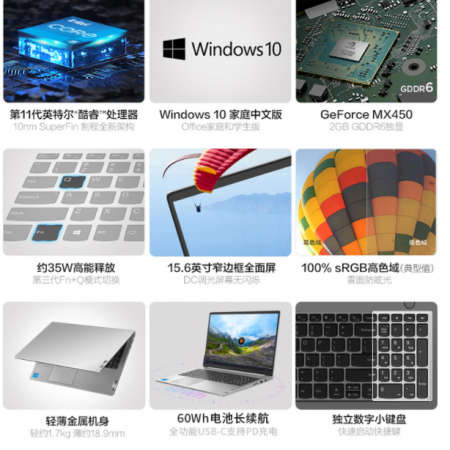 联想威6 2021款十一代酷睿i7 15.6英寸超薄本设计商务办公手提笔记本电脑 标配 i7-1165G7 16G 512G固态 MX450 2G独显