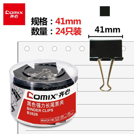 齐心 Comix 长尾夹/燕尾夹/票夹 黑色金属 2#41mm 24只/筒 办公用品工具B3626